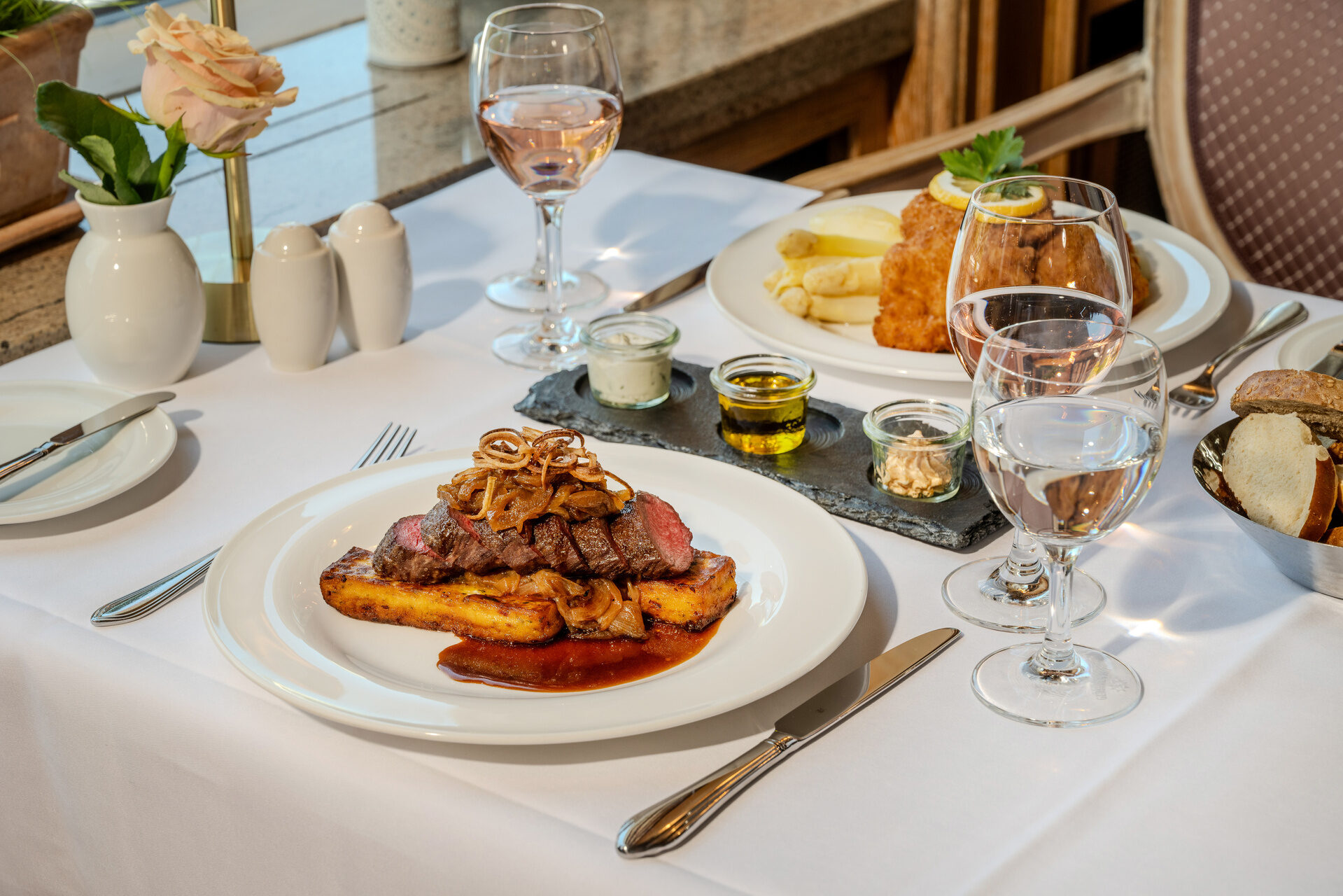 Elegant gedeckter Tisch mit schmackhafter Hauptspeise und Weingläsern im Ringhotel Seehof Berlin.